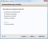 Eine praktische Arbeitserleichterung bietet die Backupfunktion: Mithilfe eines Assistenten erstellt Mobile Master ein Komplett-Backup der Smartphone/Handy-Daten (z.B. Adress- und Telefonbuch, Kalender, Notizen)